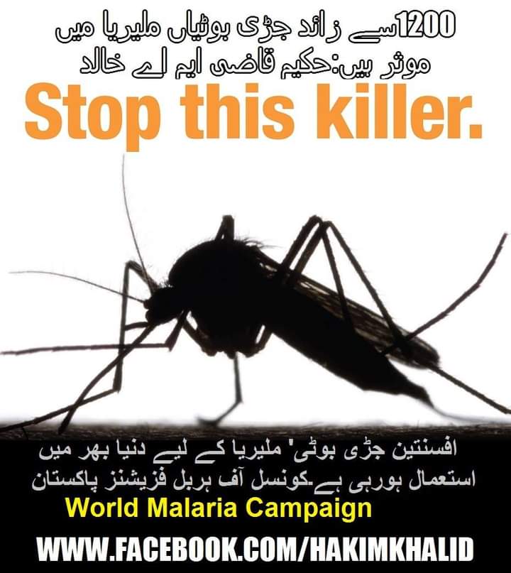 دنیامیں سالانہ 500ملین لوگ ملیریا میں مبتلا ‘دس لاکھ ہلاک ہوجاتے ہیں حکومت ملیریااور دیگر امراض سے بچاؤ کیلئے یونانی طریقہ علاج کی سر پرستی کرے 1200سے زائد جڑی بوٹیاں ملیریا میں موثر ہیں افسنتین جڑی بوٹی’ ملیریا کے لیے دنیا بھر میں استعمال ہورہی ہے۔ محکمہ زراعت اوردیگر حکومتی ادارے افسنتین کی پیداوار میں اضافہ کرکے زرمبادلہ کے حصول میں معاون ہو سکتے ہیں